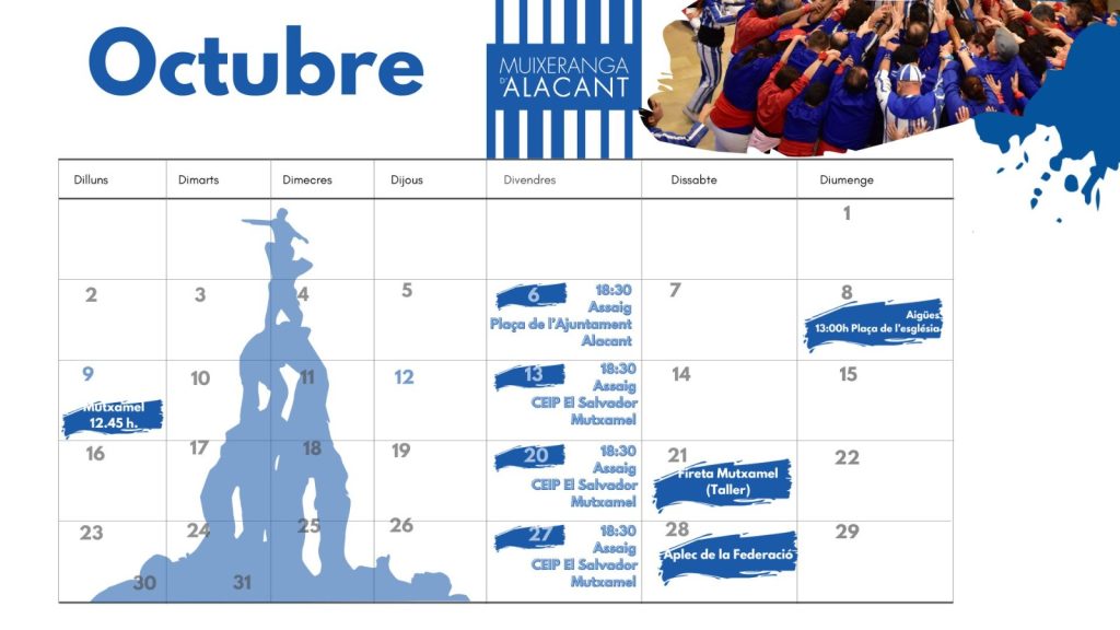 - Dimecres 11 d’octubre: 9é Aniversari de la Muixeranga d’Alacant.